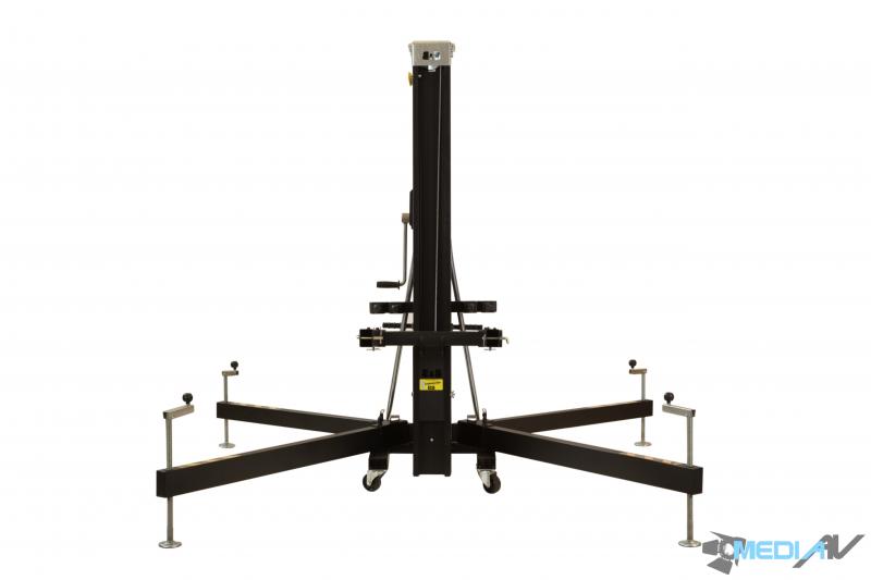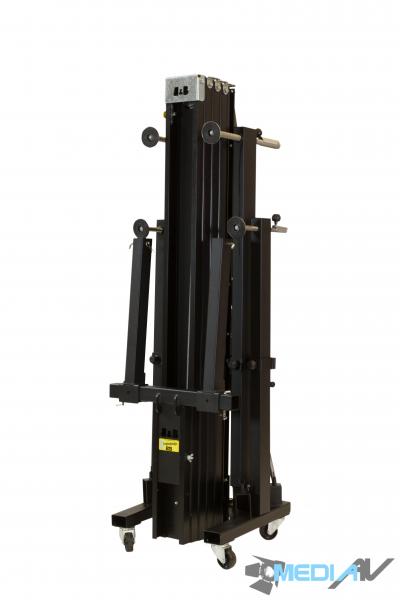 Osiąga maksymalną wysokość 6.2 metra poprzez ruchome 4 odcinki profili aluminiowych, które zapewniają maksymalne obciążenie 300 kg. Blokady bezpieczeństwa umożliwiają zablokowanie sekcji na różnych wysokościach oraz posiadaja wewnętrzny automatyczny system hamowania.Regulowane nogi i wrzeciona zapewniają doskonałą stabilność