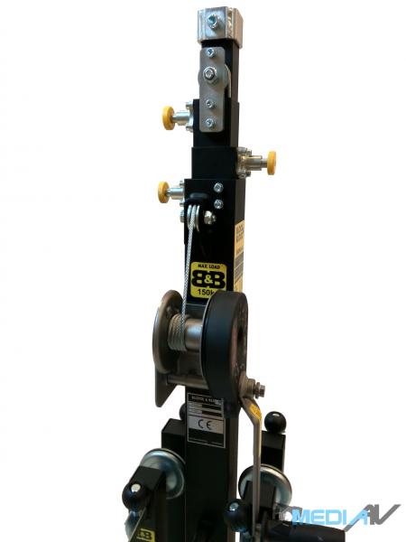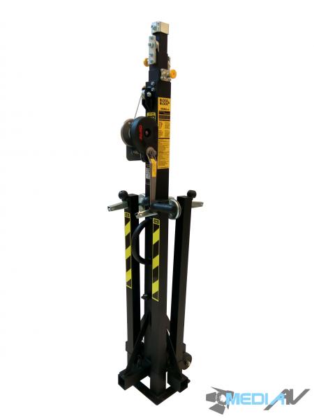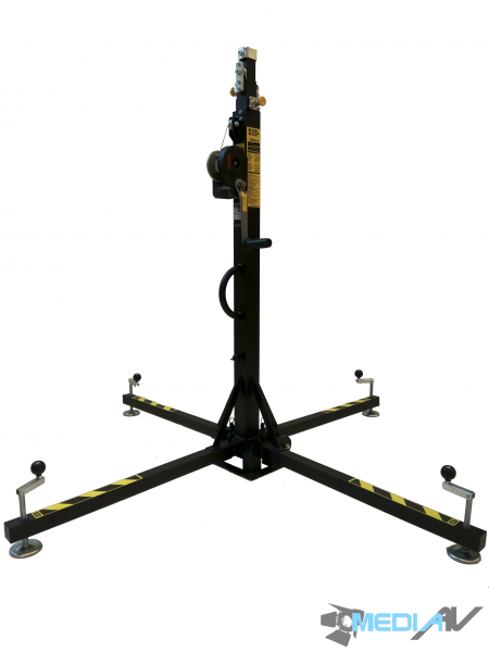 Osiąga maksymalną wysokość 4,7 metrów poprzez ruchome 4 odcinki profili telesokopowych ze stali węglowej które zapewniają maksymalne obciążenie 150 kg. Blokady bezpieczeństwa umożliwiają zablokowanie sekcji na różnych wysokościach Regulowane nogi i wrzeciona zapewniają doskonałą stabilność