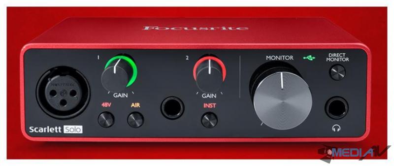 Interfejs audio Focusrite Scarlett Solo 3 generacji to jeden z bardziej popularnych interfejsów na rynku. Charakteryzuje się przede wszystkim doskonałą jakością przetwarzania analogowo-cyfrowego i niską latencją. Wyposażony został w 1 wejście mikrofonowe, 1 instrumentalne/liniowe, 2 wyjścia liniowe symetryczne i 1 wyjście słuchawkowe. Na przednim panelu znajdują się pokrętła odpowiedzialne za wzmocnienie gain każdego z wejść, przycisk załączania zasilania phantom, przycisk dostosowania impedancji wejścia dla instrumentów, przycisk załączający na wejściu efekt AIR nawiązujący brzmieniem do oryginalnego przedwzmacniacza mikrofonowego Focusrite ISA, zapewniają nagraniom jaśniejszy i bardziej otwarty dźwięk, przycisk direct monitor, pokrętło regulacji głośności wyjść liniowych oraz osobne pokrętło głośności wyjścia słuchawkowego.